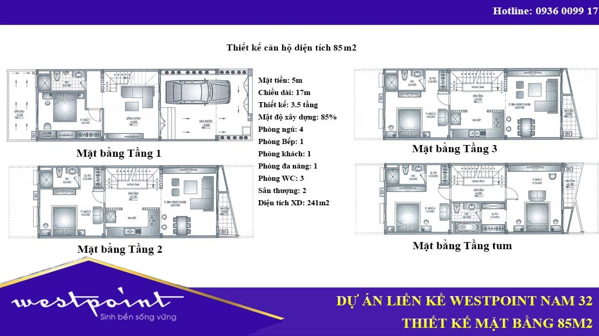 • Mặt tiền : từ 5m – 6m, tổng xây dựng từ 211m2 – 240m2 tùy theo căn.